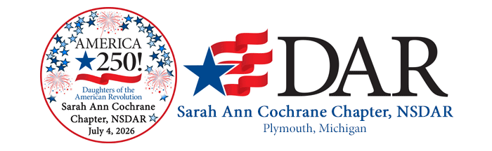 Sarah Ann Cochrane Chapter, NSDAR, members are proud to be part of the National Society Daughters of the American Revolution (NSDAR or DAR). Founded in 1890, and headquartered in Washington, D.C., the NSDAR is a non-profit, non-political volunteer women’s service organization dedicated to promoting patriotism, preserving American history, and securing America’s future through better education for children.